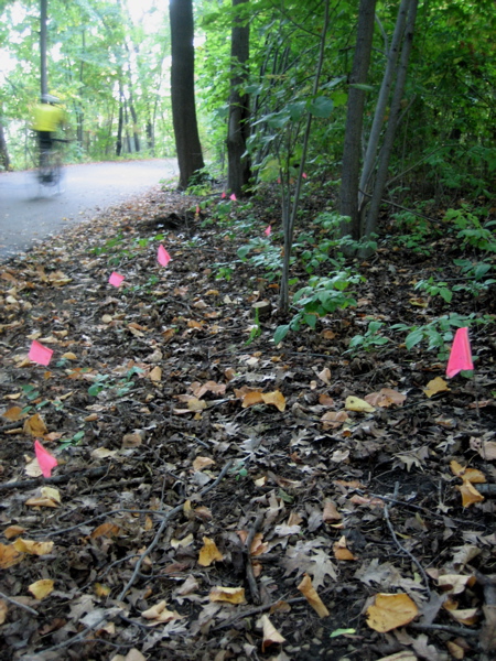 HINT: The adjacent drive, built in 1904 by the Madison Park and Pleasure Drive Association, was routed too close to a line of conical mounds, now outlined by flagging.